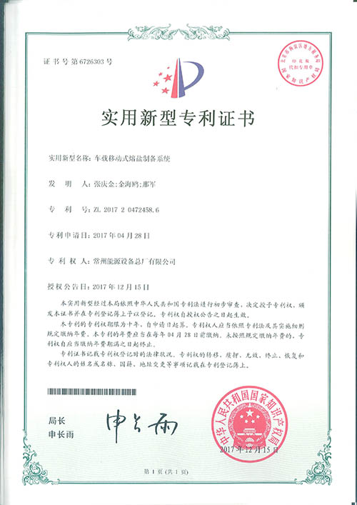 近日,常州能源设备总厂有限公司的“车载移动式熔盐制备系统”获得国家实用新型专利证书,专利号为:ZL 2017 2 0472458.6