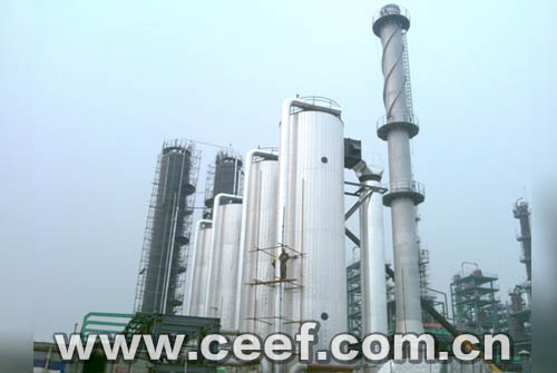 现场图片中央为安装完成的4台1350大卡/ 小时燃油炉,远处是施工中的大型塔器。